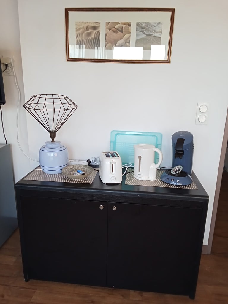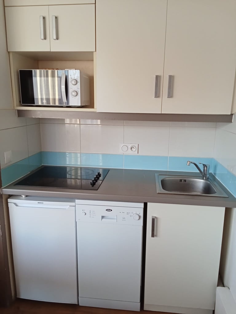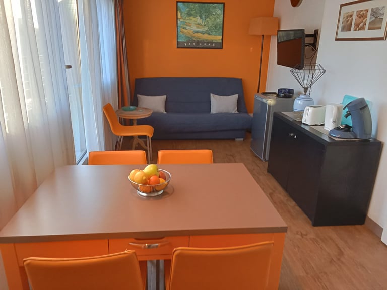 Questo appartamento con aria condizionata comprende 1 camera da letto, un soggiorno, una cucina con utensili, frigorifero e macchina da caffè e 1 bagno.